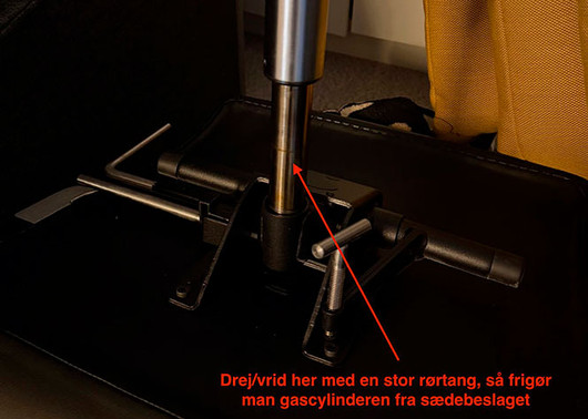 Vend stolen om og læg den i en anden stol eller på et bord. Afmonter låseanordningen med en skruetrækker i bunden af gaspatronen. Træk nu hele understellet op mod loftet og af. Brug en stor rørtang og drej/vrid nu selve gaspatronen løs fra sædebeslaget.