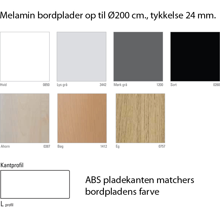 Vælg bordplade mellem 7 melamin farver og 4 stelfarver.